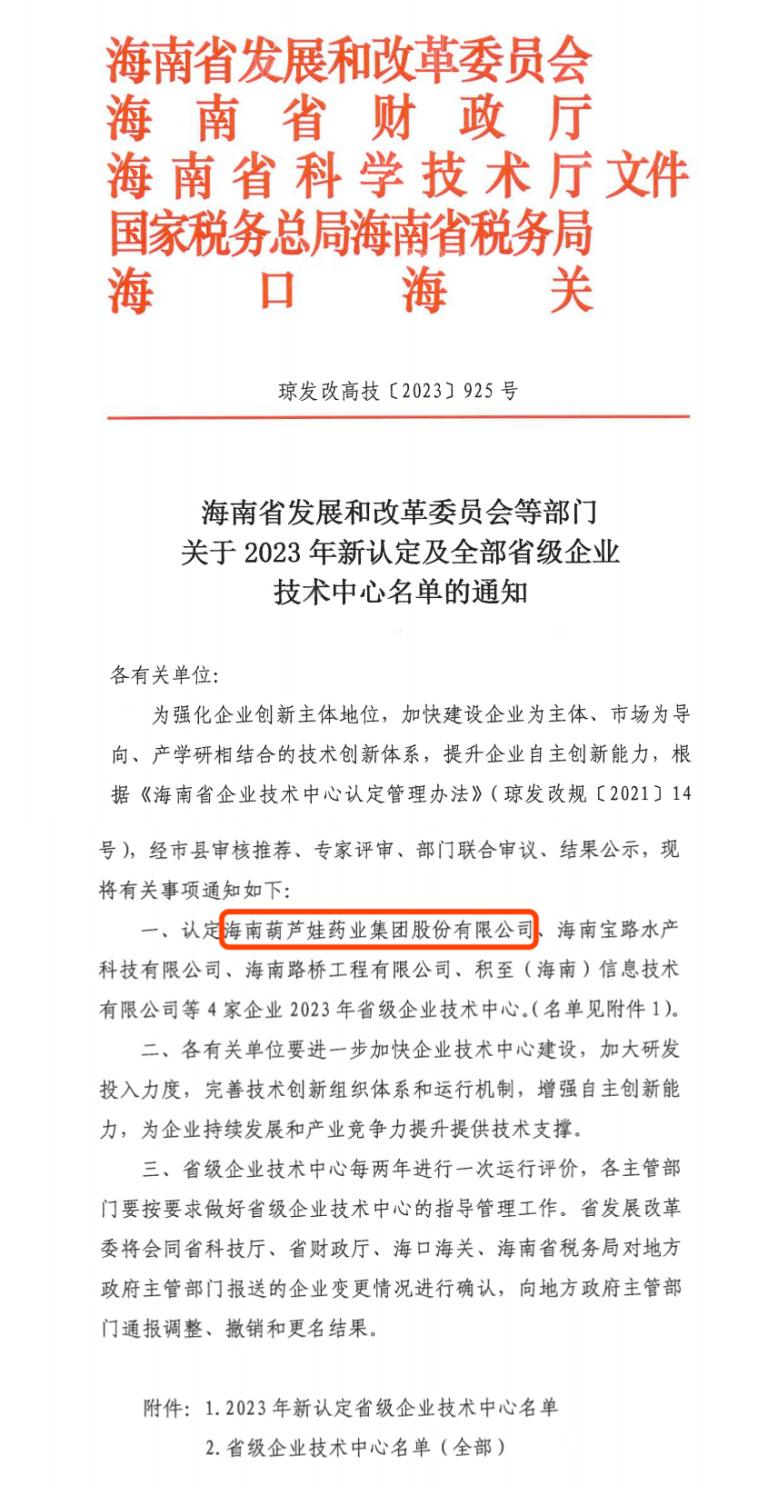 近日,海南省发改委等多部门联合公布了《关于2023年新认定及全部省级企业技术中心名单的通知》,其中,海南d88尊龙z6药业集团股份有限公司成功通过评审,被认定为省级企业技术中心,是本次获批的4家企业之一。